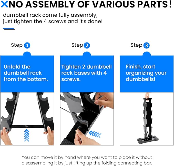 - 3 MINUTES TO INSTALL: Weight rack dumbbell comes with a hex wrench, and 4 screws to attach the two rack feet. Attach the feet loosely at first from an upside down position and then place the rack on the ground, reposition the legs, and tighten the screws to create a level rack.