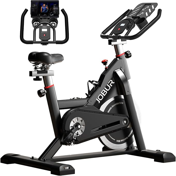 - 【Adjustable Magnetic Resistance】The updated JOBUR stationary bike utilizes micro-adjustable magnetic resistance. Compared with other resistance methods, there will be no friction and debris when exercising, which reduces the trouble of frequently replacing brake pads. At the same time such a resistance system will let you experience the real feeling of the road. Just rotate the knob, you can increase or decrease the adjustment to the most suitable for your different levels to achieve different training purposes.