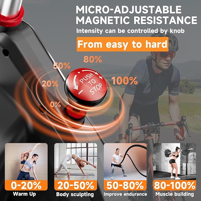 - 【Silent Workout】Ingenious micro-adjustable magnetic resistance design provides a smooth, quiet ride without disturbing neighbors or sleeping children. For added safety, the emergency brake function ensures an immediate stop, giving you peace of mind during your indoor ride.