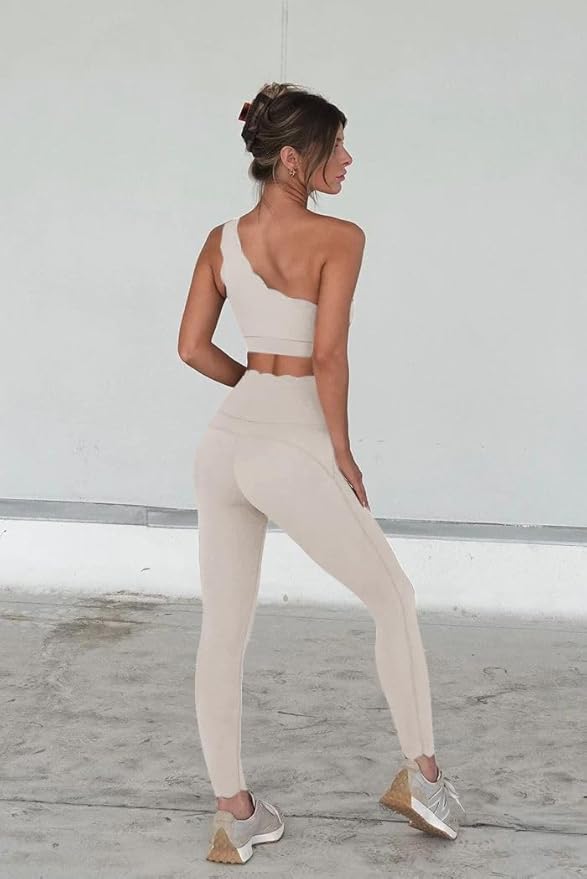 - Sets Chic Design: This stylish workout ensemble showcases several distinctive features that seamlessly blend fashion and function. The high-waisted leggings feature a scollop design, adding a touch of feminine elegance to your activewear. One-shoulder sports bra exhibits a trendy asymmetrical design, offering a modern twist on traditional athletic wear. Ensuring your every move is unhindered, whether you're doing fitness or practicing yoga