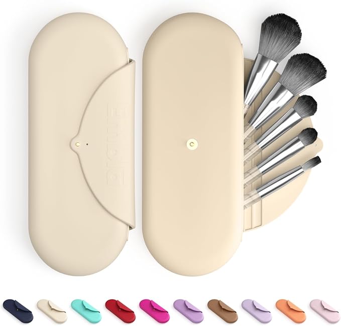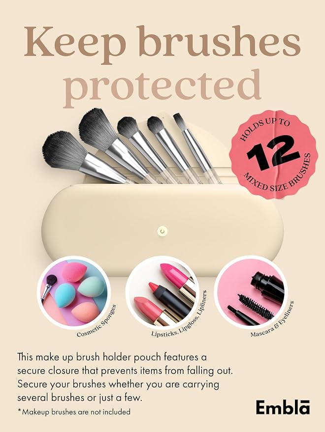 Embla Makeup Brush Holder Travel Cosmetic Case Pouch, Soft Silicone Cosmetic Bag Make Up Brushes Holder with Secure Snap Closure, Travel Makeup Brush Case, Champagne