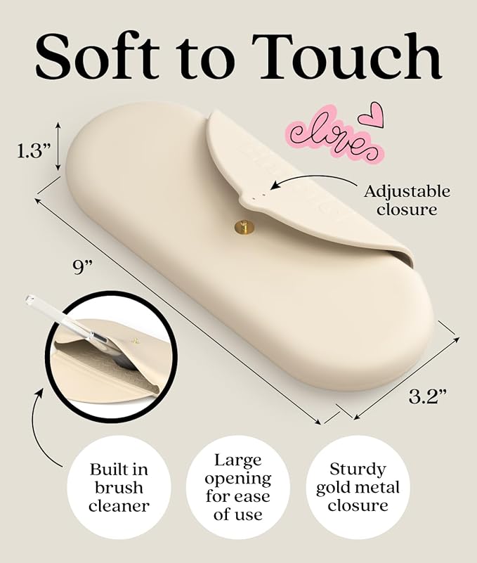 - SOFT TOUCH SILICONE WITH SECURE GOLD METAL CLOSURE. This makeup brushes holder is made of skin-friendly soft silicone that is lightweight, durable and resistant to deformation. The brush holder pouch also features a secure closure that prevents items from falling out and makes it easy access to your cosmetic brushes.