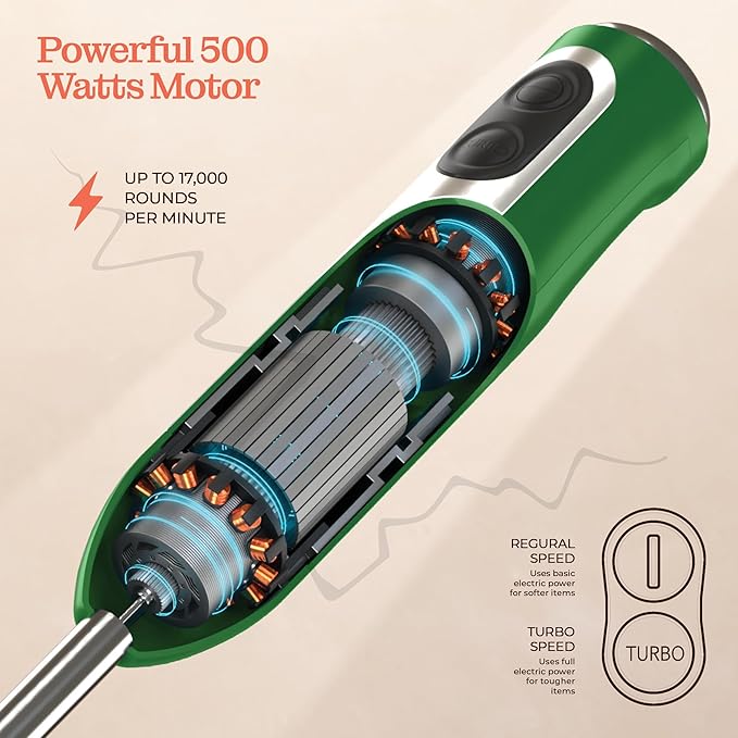 - Powerful Blender - The hand blender has a motor of 800 watts with four ultra forceful blades that grind the toughest meats, ice, and fruit for smoothies, patties, soups, and any other smooth concoction.