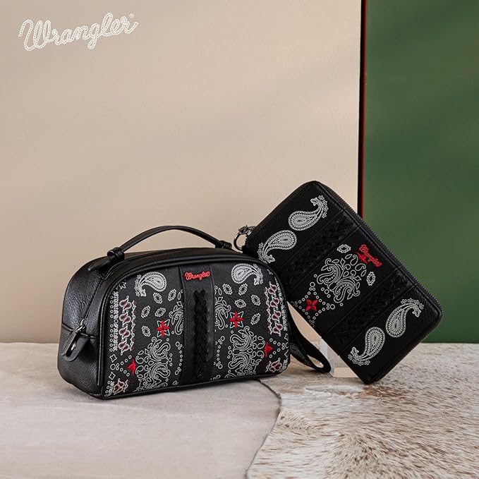 - Stylish Western Paisley: Featuring a bandana print and embroidered Wrangler logo, this bag adds a fun western touch to your travel gear.