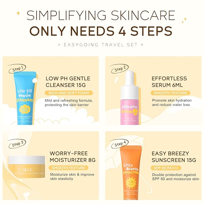 - 【4-Piece Essential Travel Size Skin Care Set】The Skin care travel kit has your favorite skincare products, suitable for both travel and holiday travel to protect your delicate skin! Cleanser, serum, face cream and outdoor essential SPF 50 sunscreen can keep skin clean, balanced and super moisturized when traveling.