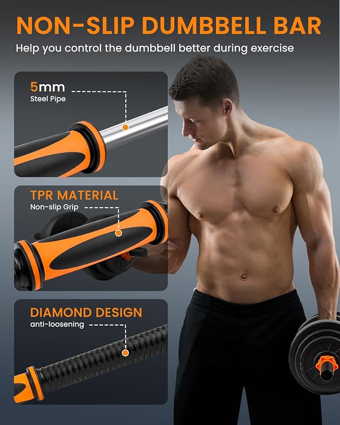 - 【NON-SLIP DUMBBELL BAR】The surface of the dumbbell bar is made of TPR environmentally material and attached to a non-slip texture, which strengthens the friction of the hand and helps you control the dumbbell better during exercise