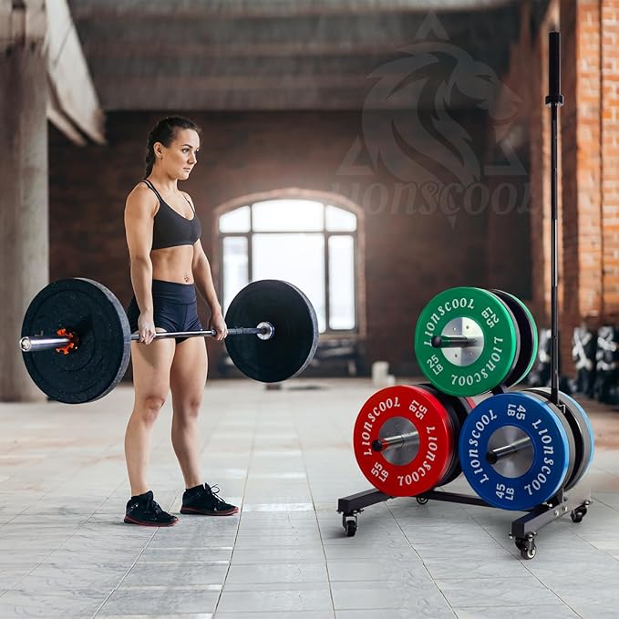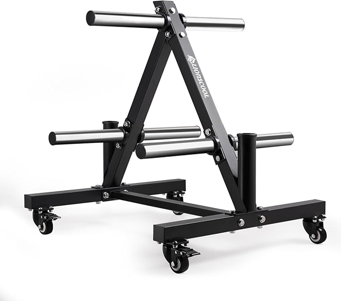 LIONSCOOL 2-Inch Olympic Weight Plate Tree and 2 Barbell Holders, Bumper Plate Storage Rack with Optional Wheels, 650LBS/1000LBS Weight Capacity Available