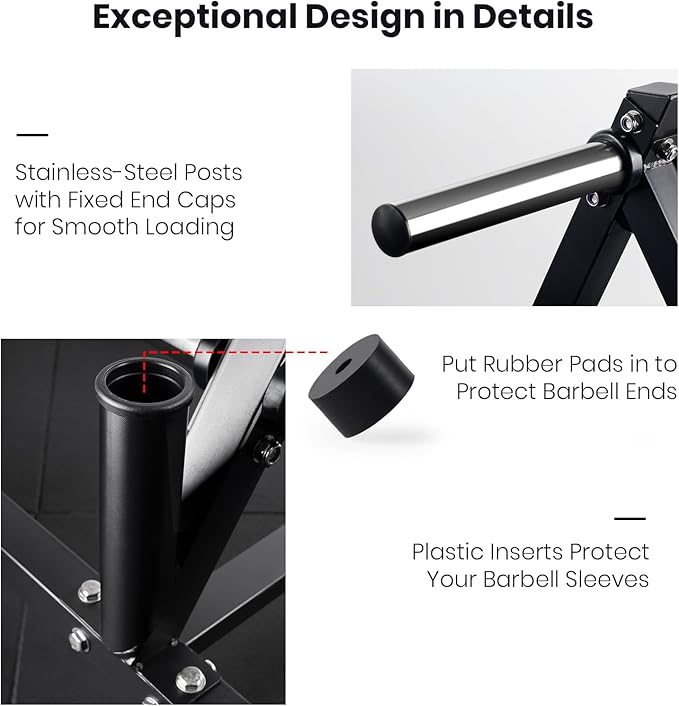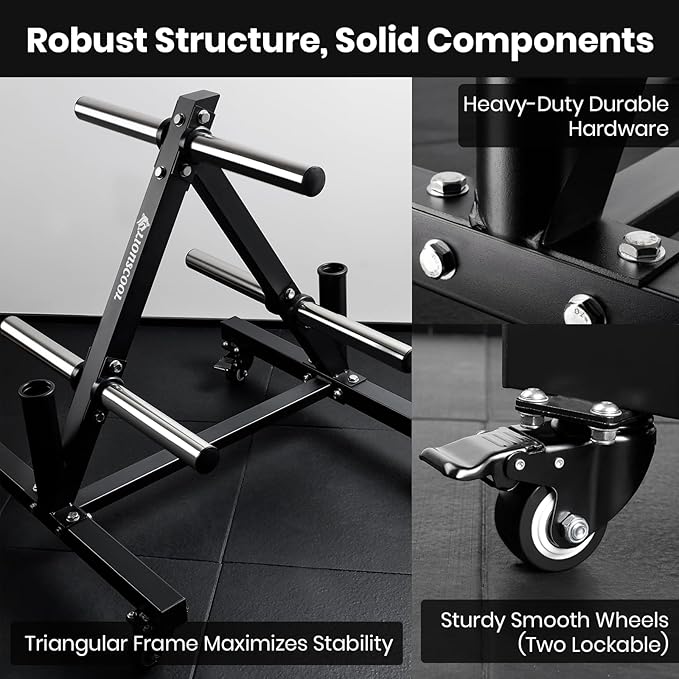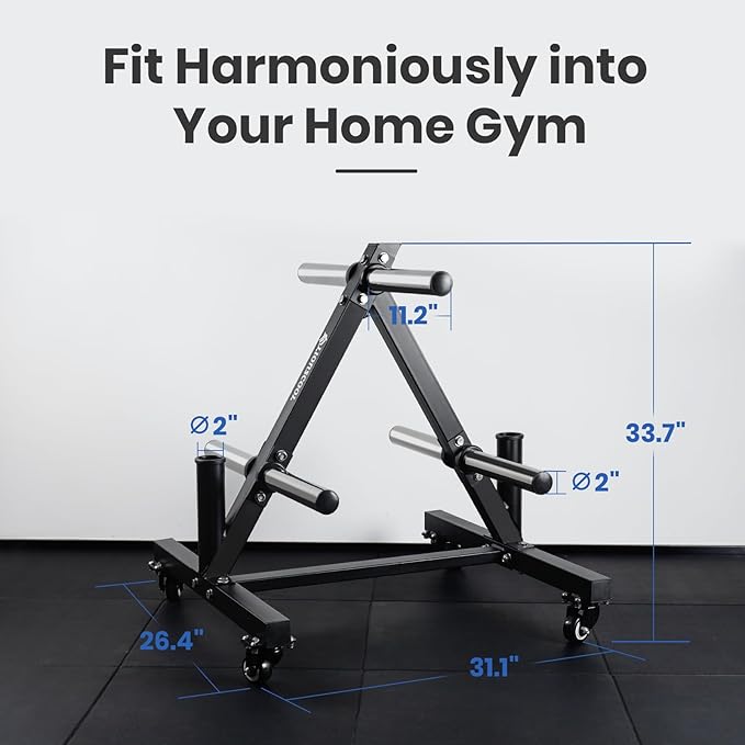 - Multipurpose, Sleek and Space Saving: The plate tree is equipped with two sturdy barbell holders to fit 2-inch barbells. Both have plastic inserts securely attached and rubber pads to put at the bottom to prevent your barbell sleeves from scratching. Each post measures 11.2”, long enough to hold 4x45lb bumper plates. The whole frame is matte black powder coated, rust resistant and visual appealing. The total size of the tree is 31.1”x26.4”x33.7” (with wheels) / 31.1”x26.4”x31” (no wheels).