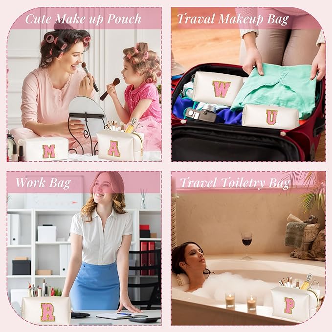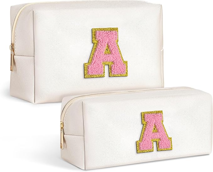- Unique Fashion Design: You will get 2 pack makeup bag in total, features a gold glitter chenille patch with your initial for a personalized touch, make your bag unique and eye-catching. Comes with 26 letter styles to choose from, you can choose your initials or other letters with special meaning according to your preference