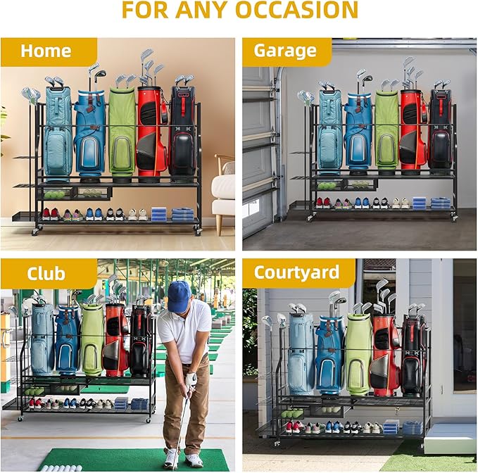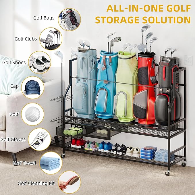 - Room for All Your Gear: Easily store up to 5 golf bags, 24 clubs, and more accessories in one convenient rack. Includes 2 drawers for secure storage of balls, brushes, and other essentials, keeping everything within arm's reach
