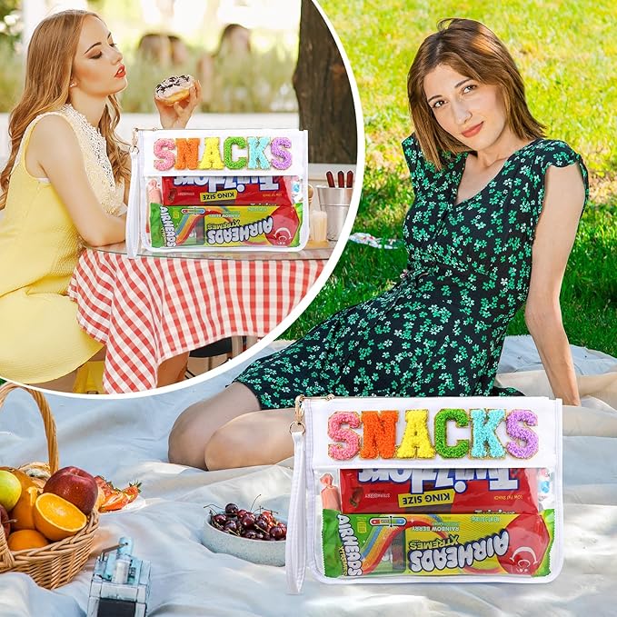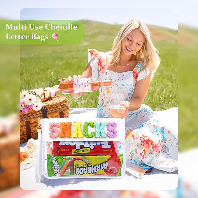 - Glitter Chenille Letters: Clear SNACKS makeup bag comes with the SPF chenille letter patches.These colorful letters have a fun glitter border that is sure to stand out from all of your other cosmetic toiletry bags!