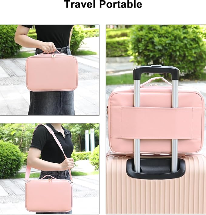 - Travel Portable: The makeup case comes with a shoulder strap, and luggage strap, offer an easier way to carry, and make up well when you on the outside or traveling somewhere. The back of the makeup brush compartment has a thick sponge to protect the mirror when closed, not easy to break when traveling.