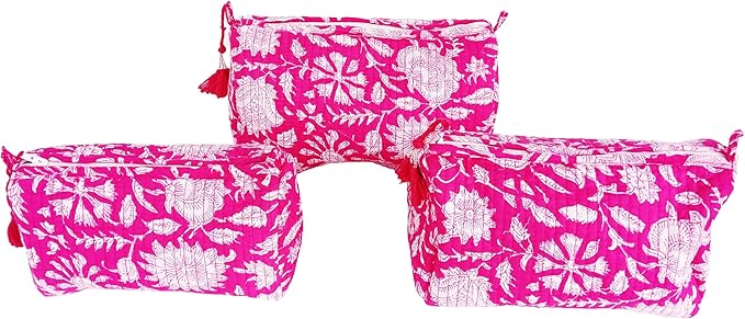 Rastogi Handicrafts Cosmetic Bags Set, 3 Piece Make Up Organizer Bag Storage Bags with Zipper Closure (3, Pink, Design-5)