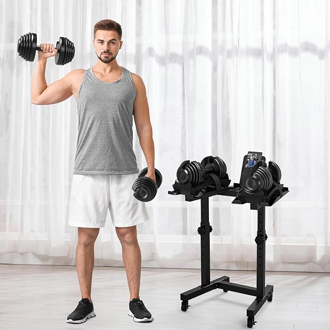 - [Smooth Wheels & Tablet Holder] The weight stand features four wheels for easy movement around your home gym, and two of them are lockable to keep it in a specific position. It also has a tablet holder for convenient access to your workout routine on your device, allowing you to keep it within reach while training.