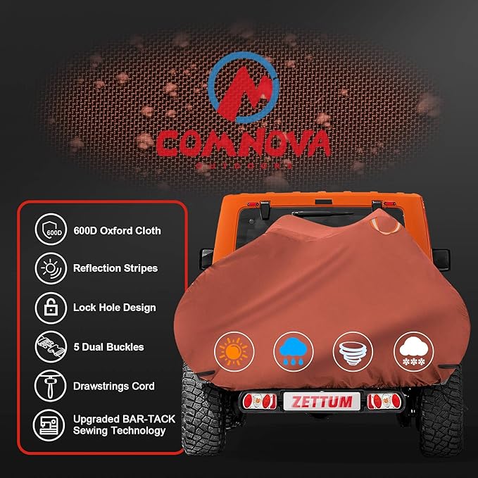 - | Fading-Resistant Cover for Years | - UV Test can reproduce the damage caused by sunlight, rain and dew through the equipment. The test shows that Zettum 600D bike cover can withstand at least 3 years of UV aging, which is much better than most others.【Note】: As the whole cover may block small cars' taillights, please consider installing with additional taillight on the bike rack!!