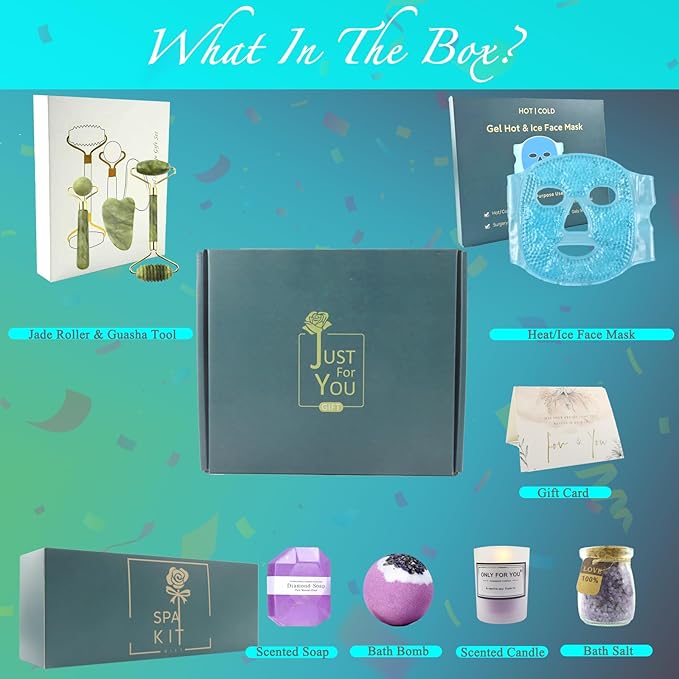 - 🎁 What In the Gift Box - Skin Care Tools : The gifts basket include 9pcs practical skincare tools for your recipient to do daily skin regimen: 2pcs jade rollers and 1pcs GuaSha tools for face, 1pcs reusable heat & cold therapy face mask, 1pcs scented candle, 1pcs scented soap, 1pcs fizzy bath bomb, 1pcs bath salt, 1pcs greeting card. No matter for self use or gifting her, It's just a very cost-effective investment