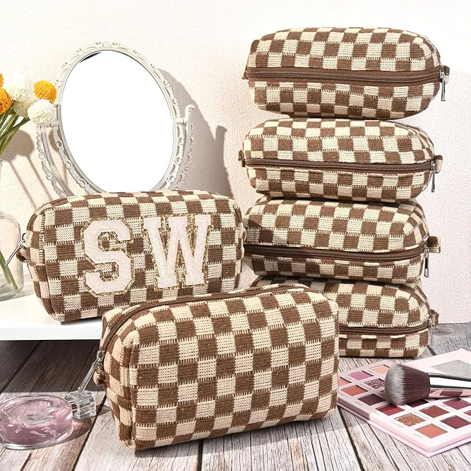 6 Pcs Preppy Makeup Bag Bulk Checkered Cosmetic Bag Brown Makeup Pouch Personalize Travel Toiletry Bag Organizer Cute DIY Makeup Brushes Storage Bag for Women