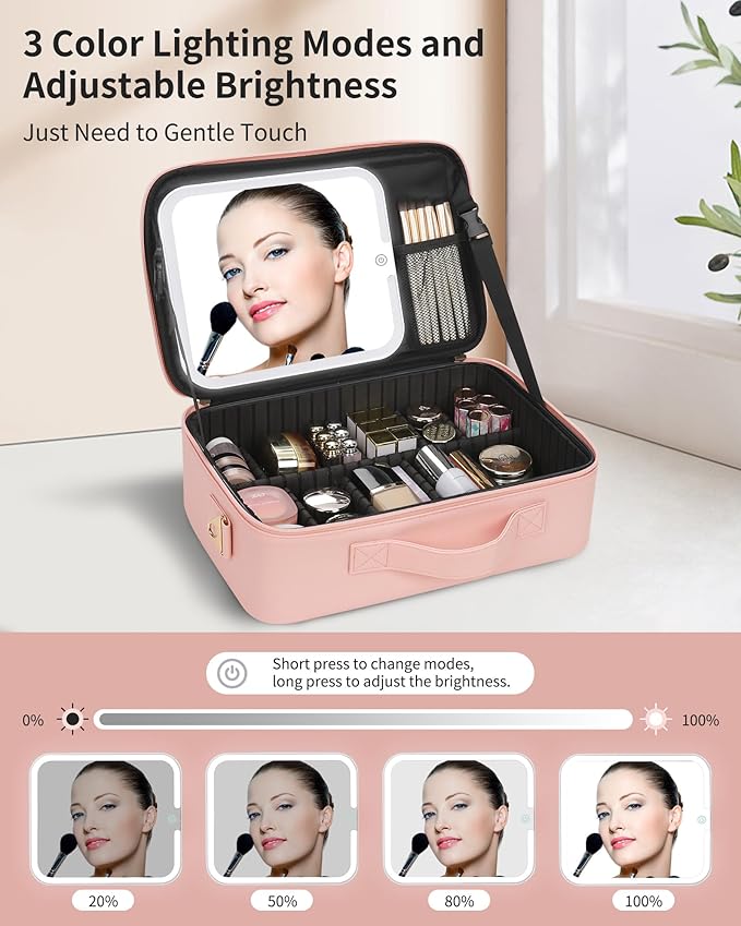 MONSTINA Makeup Bag with LED Mirror,Lighted Make up Travel Case Cosmetic Bag Professional Cosmetic Artist Organizer with LED Light Mirror,3 Adjustable Brightness for Girls and Women,Middle Pink