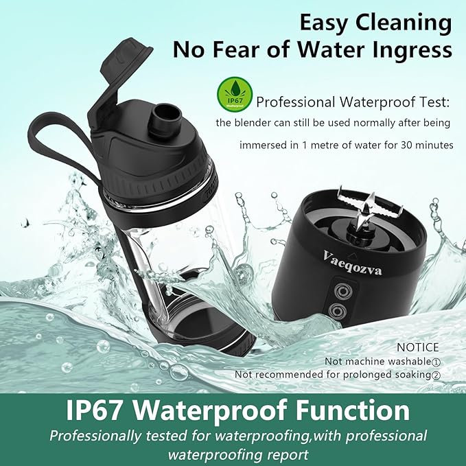 - WATERPROOF & EASY TO CLEAN: The Vaeqozva small smoothie blender is IP67 waterproof,double-click to turn on the self-cleaning mode,or just rinse mini blender with water,which makes it very easy to clean. Tips:Don't immerse the portable blender in water