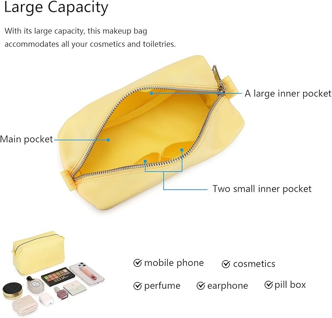 Organizer Bag Lightweight Cosmetic Bag with Ring Clasp Perfect Travel Makeup Bag for Women nylon Stand Up Design (Yellow/Nylon)