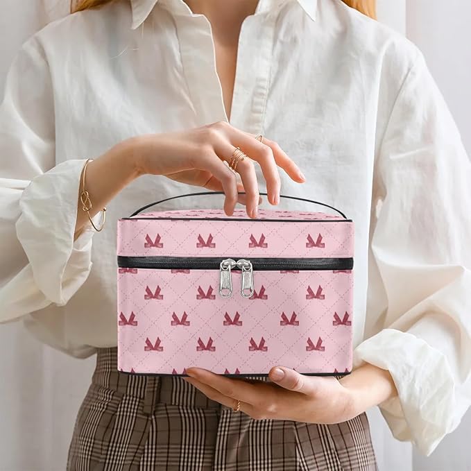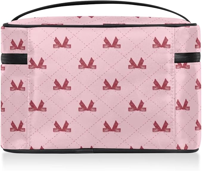 Large Makeup Bag Travel Cosmetic Bags for Women Pink Cute Plaid Checkered Geometric Makeup Organizer Case Toiletry Bag for Girls Traveling Wide Open Portable Pouch with Handle