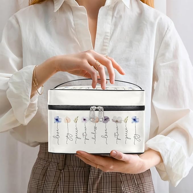 Large Makeup Bag Travel Cosmetic Bags for Women Watercolor Vintage Boho Spring Flower Floral Makeup Organizer Case Toiletry Bag for Girls Traveling Wide Open Portable Pouch with Handle