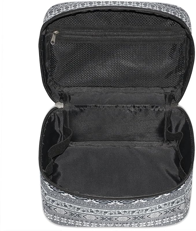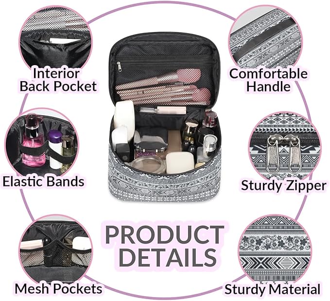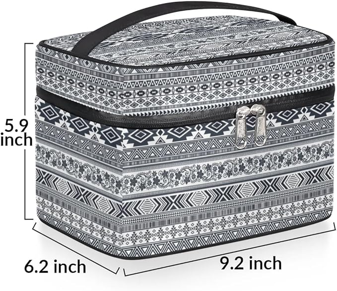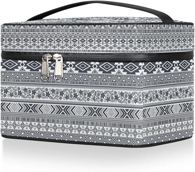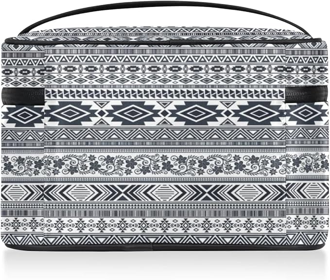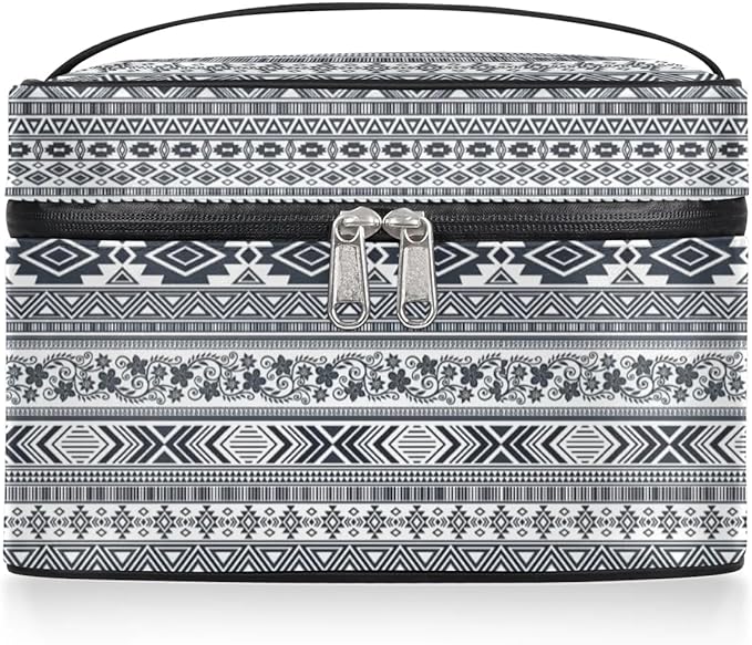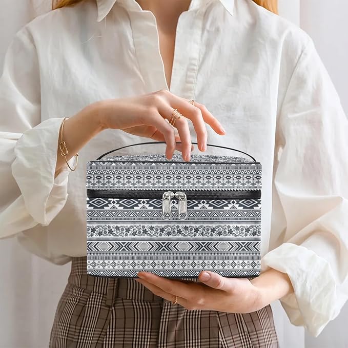 Large Makeup Bag Travel Cosmetic Bags for Women Grey Vintage Boho Geometric Chevron Aztec Makeup Organizer Case Toiletry Bag for Girls Traveling Wide Open Portable Pouch with Handle