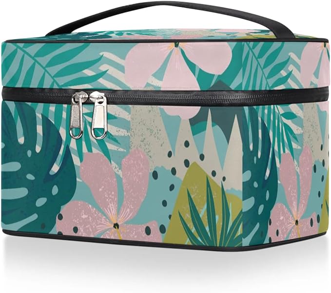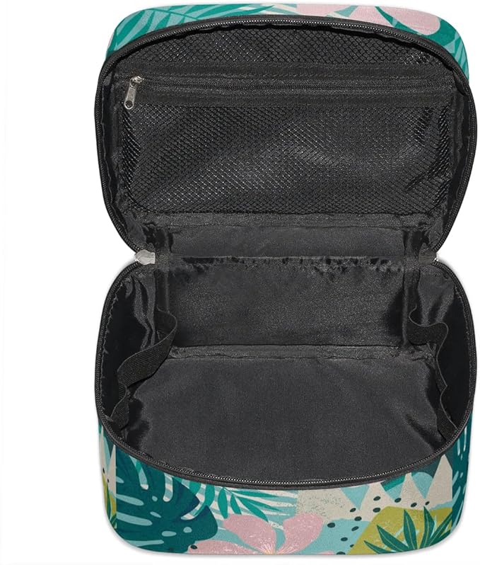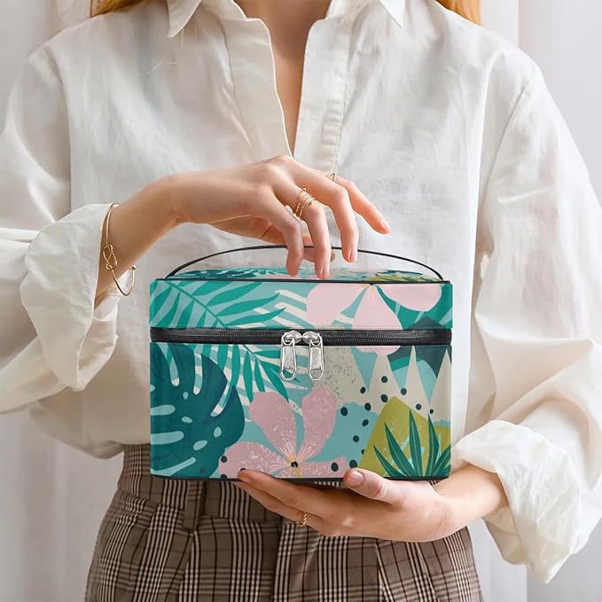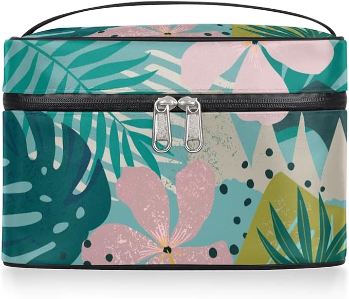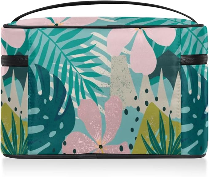 Large Makeup Bag Travel Cosmetic Bags for Women Teal Pink Tropical Palm Flower Floral Makeup Organizer Case Toiletry Bag for Girls Traveling Wide Open Portable Pouch with Handle