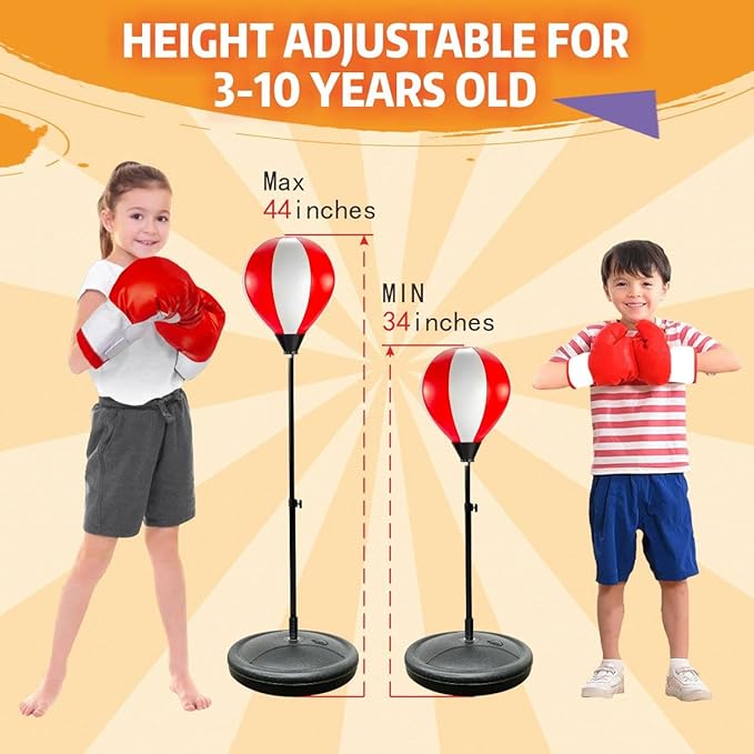 - High-quality: kids punching bag with stand is adjustable (34-44in) for the punching of the children. The interesting kids punching bag both builds arm strength and hand-eye coordination and protects eyes by keeping them away from digital screens.