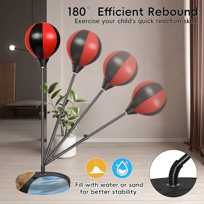 - Height Adjustable Stand: The height of the boxing set's stand is adjustable from 31 to 44 inches, making it suitable for children ages 3 - 8 years old. High-quality springs help the punching bag rebound quickly after being hit