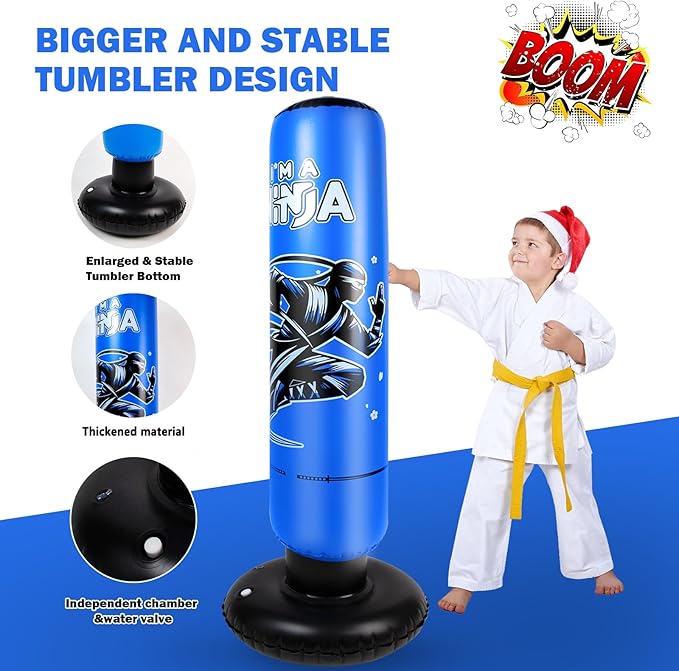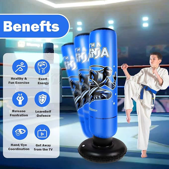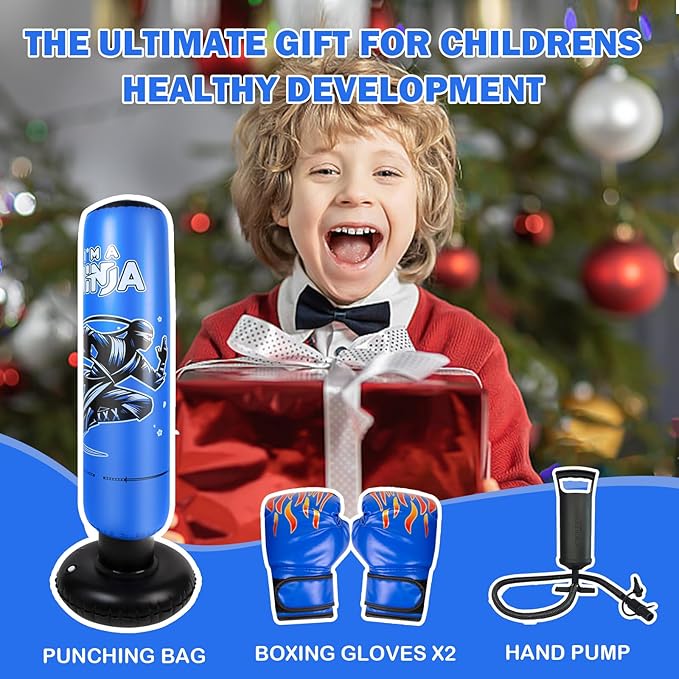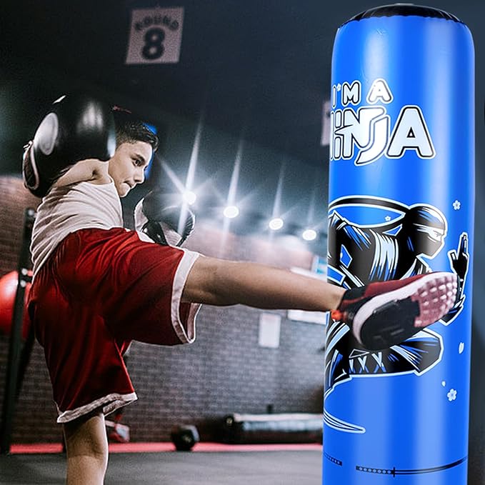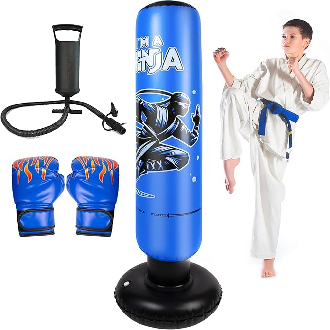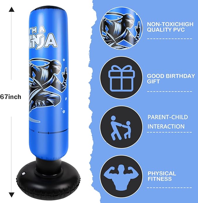 - LARGER KIDS BOXING BAG GIFT SET: When you purchase our kids ninja boxing set,You get a hand inflation pump,A pair of boxing gloves,A 67" ninja inflatable kids boxing bag,and two patches.Our boxing bag is 67" (H)/168 cm (inflated).Weighs only 3.2 lbs/1.45kg.Lightweight and easy to move.Perfect for kids ages 5-12 years old!