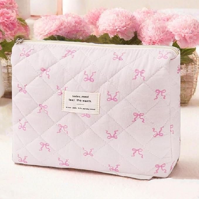 3 Pcs Quilted Makeup Bag Set,Coquette Bow Make up Bag,Cute Floral Makeup Bags Large Travel Toiletry Cosmetic Bag Organizer for Women Girls (I-3PCS)