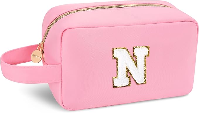 - UNIQUE INITIAL DESIGN: This monogram initial makeup bag with a sewn chenille letter is the perfect custom gift for beauty lovers. Featuring a portable handle and available in 26 letters, it's ideal as a personalized travel makeup bag organizer, adding a unique, stylish touch to your journey!