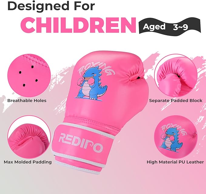- 【ERGONOMIC DESIGN】-- Ergonomic design with extra-thick protective padding on the knuckles provide ultimate safety in every punch. Redipo 4 & 6 OZ boxing fighting gloves are suitable for kids ages 3-9.