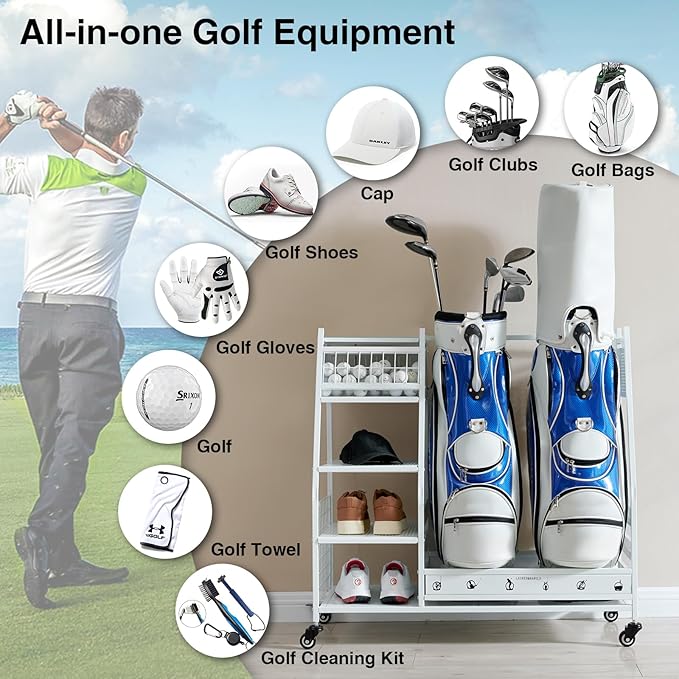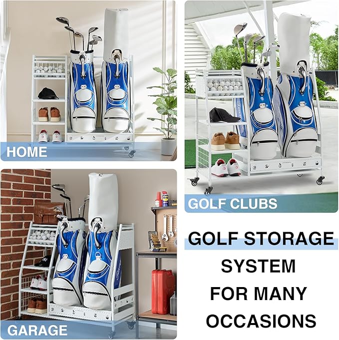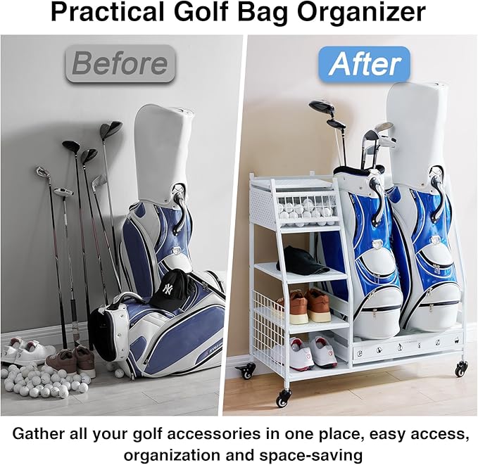 - Multi Occasions: Our golf bag storage can organize almost all your golf accessories, keep your sports and golf equipment in one place, say goodbye to cluttered garages, basements, homes, yoga studios, golf clubs, athletic departments, and storage rooms that are easy to access and space-saving. Christmas is coming up, this superior quality uniquely designed golf rack is the ideal gift for your boyfriend, husband or friends.