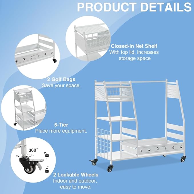 - Large Storage Space: Ideal for golf equipment storage solutions, this golf organizer has 3 main storage parts: the right main single-layer storage part holds 2 golf bags or 1 extra large size golf travel bag; on the top left is 1 closed-in net shelf basket with lid for golf balls and other golf equipment, and the top lid serves as an organizer for towels and other items to increase storage space. Below left are 3 medium-sized shelves for small golf items such as sneakers, hats, or gloves