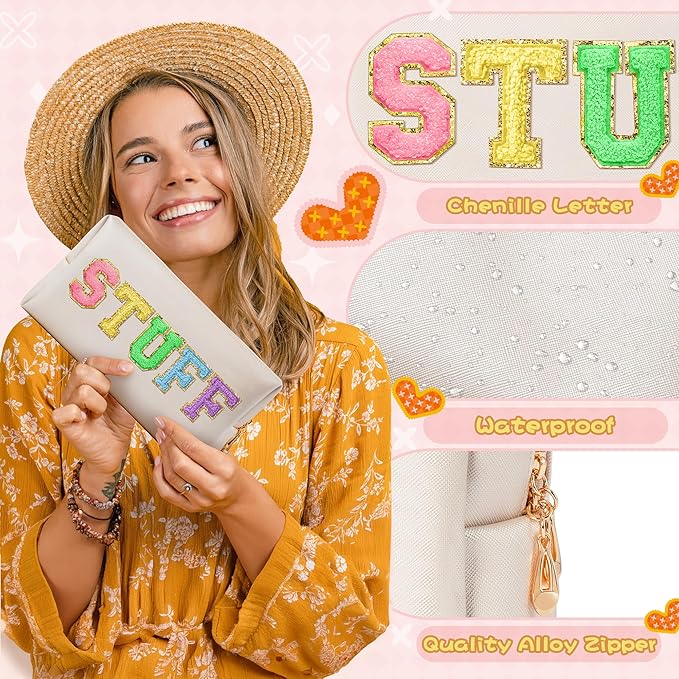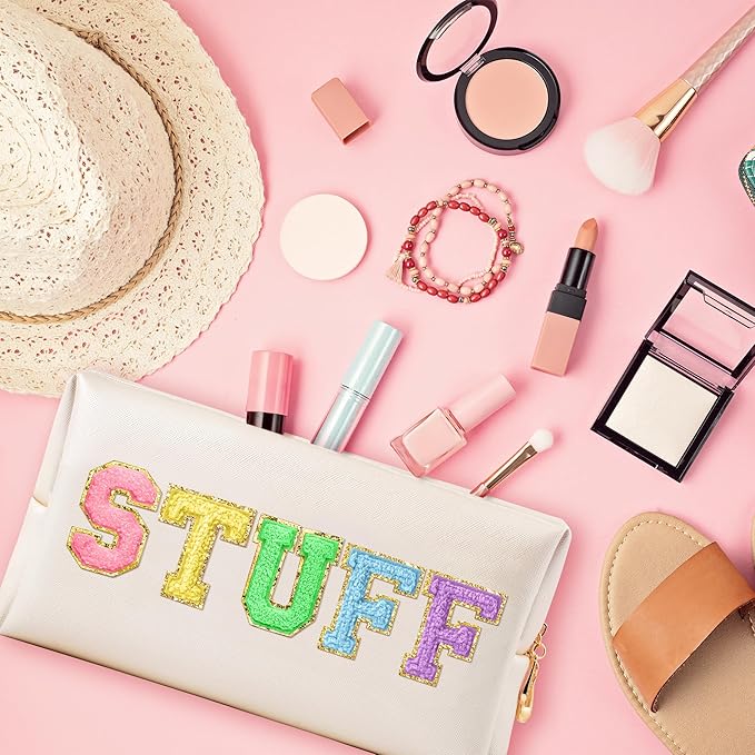- Vibrant and Fun Design: This colorful makeup bag features bold chenille patch letters spelling "STUFF" and is accented with shell gold PU leather, making it a trendy and practical accessory for women and girls. Ideal for adding a playful touch to your travel essentials.