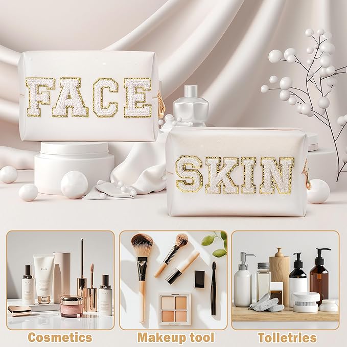 - Preppy and Stylish Design: This 2-piece cosmetic bag set includes "SKIN" and "FACE" chenille letter patches with elegant PU leather accents. The preppy design makes these bags a trendy accessory for women and girls, perfect for Christmas gifts.