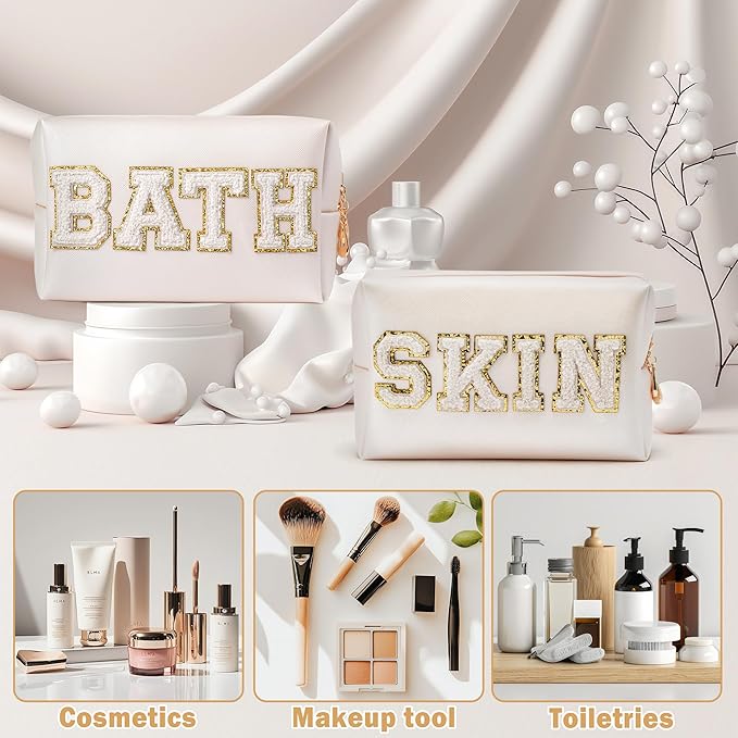 - Preppy and Stylish Design: This 2-piece cosmetic bag set includes "SKIN" and "BATH" chenille letter patches with elegant PU leather accents. The preppy design makes these bags a trendy accessory for women and girls, perfect for Christmas gifts.
