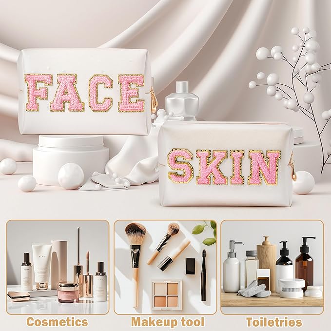 - Preppy and Stylish Design: This 2-piece cosmetic bag set includes "SKIN" and "FACE" chenille letter patches with elegant PU leather accents. The preppy design makes these bags a trendy accessory for women and girls, perfect for Christmas gifts.