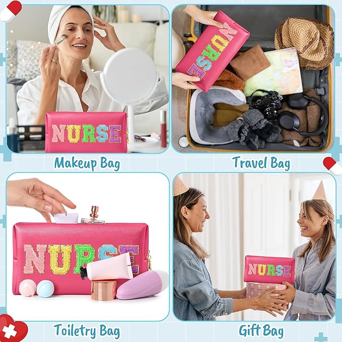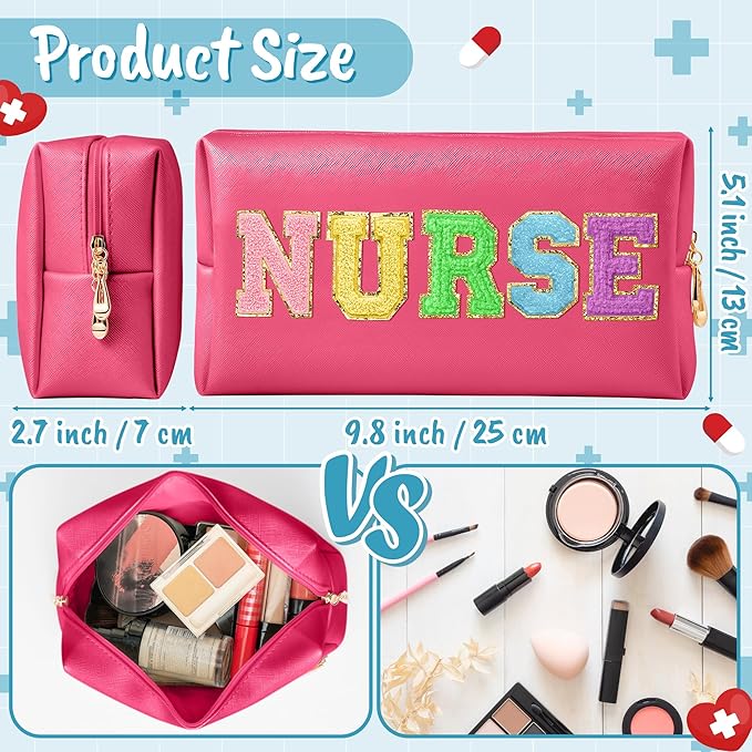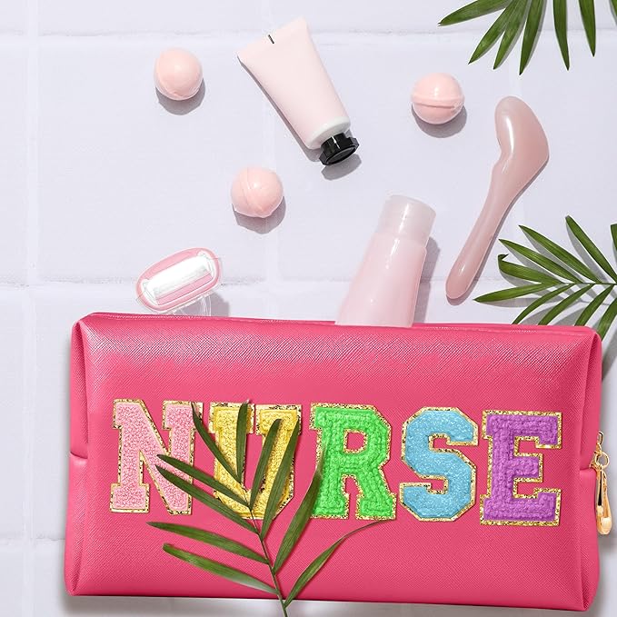 - Elegant and Practical Design: This colorful makeup bag is adorned with pink PU leather accents and bold chenille patch letters spelling "NURSE." It's the perfect blend of style and function, making it an ideal gift for nurses during the holiday season.