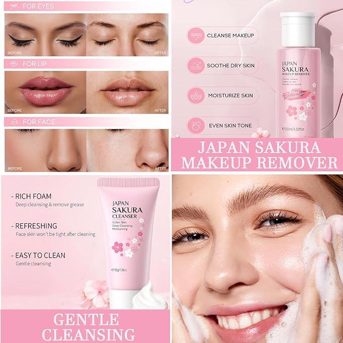 - TRAVELKIT FOR WOMEN:As we age, our skin loses its vitality and becomes dry and dehydrated. Cherry blossom extract helps fight wrinkles and blemishes. Regular use of sakura-ingredient skincare set helps to add moisture to the face and skin, nourishes the skin and helps to maintain its natural beautiful.