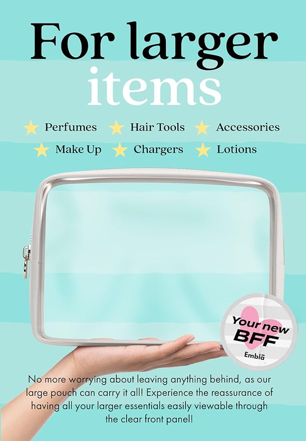 - TRAVEL IN STYLE - Need a clear makeup bag small or large for traveling to carry on to your airline flight? Our transparent TSA approved toiletry bag pouches will make your traveling stress free. This versatile bag can be used as a clear toiletry bag, makeup pouch, makeup case, or storage bag, making it the perfect companion for any occasion! The PVC vinyl clear makeup bag travel bag by Embla should be included in any travel essentials for women.