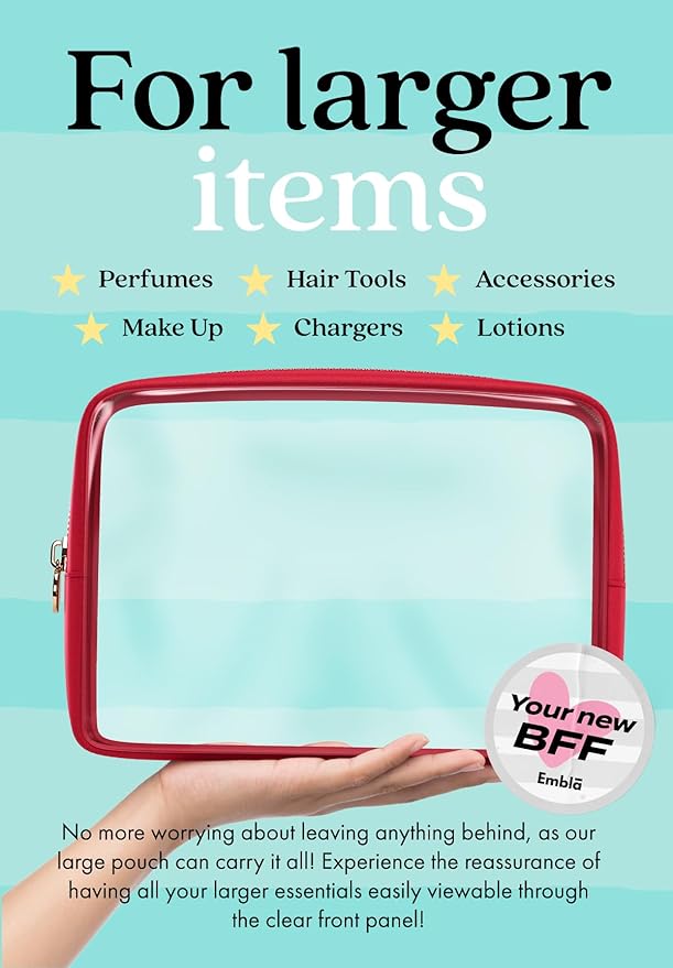 - TRAVEL IN STYLE - Need a clear makeup bag small or large for traveling to carry on to your airline flight? Our transparent TSA approved toiletry bag pouches will make your traveling stress free. This versatile bag can be used as a clear toiletry bag, makeup pouch, makeup case, or storage bag, making it the perfect companion for any occasion! The PVC vinyl clear makeup bag travel bag by Embla should be included in any travel essentials for women.