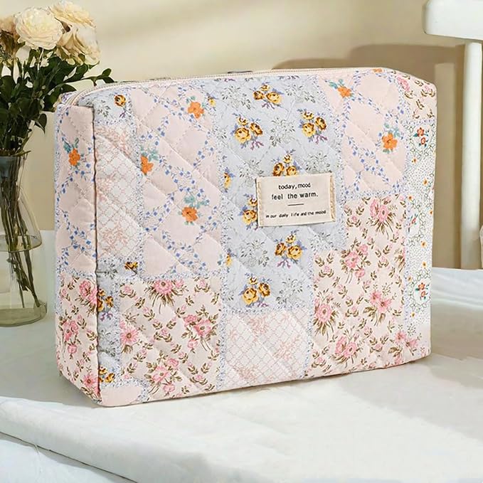 Quilted Makeup Bag,Floral Makeup Bag,Cotton Makeup Bag Set for Women,Travel Makeup Bag,Large Toiletry Cosmetic Bag Makeup Bag Organizer for Women Girls (M2-1PC)