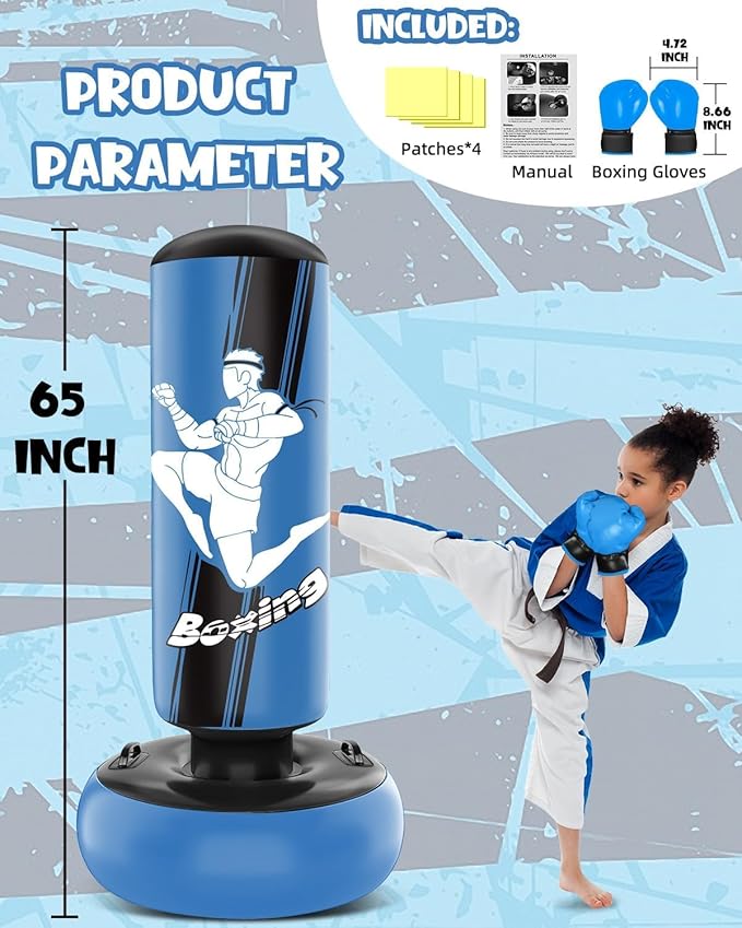 - Ideal Size for Training: Standing at 65 inches when fully inflated, with a wide 23inch base, this punch bag provides stability and is perfect for kids aged 3 to 14. Encourage family time and keep kids active at home. For added stability, fill the base with over 6 gallons of water.