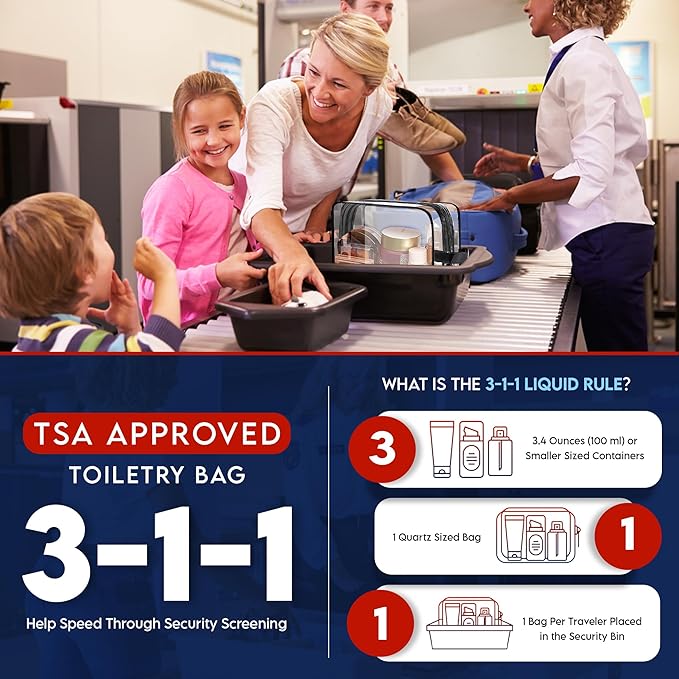 - TSA-Approved: VYRL clear travel bags for toiletries strictly adhere to the TSA 3-1-1 liquids rule. The quart-size transparent clear cosmetic bag design ensures a swift pass through airport security & easily spot your essentials in a breeze.