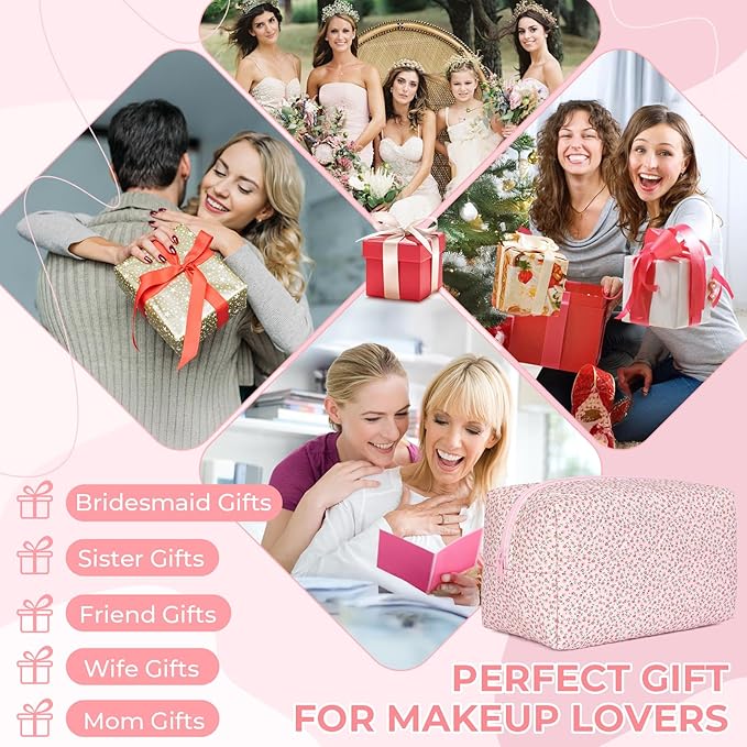 - Perfect Gift:Quilted makeup bag set is the perfect gift for friends, girlfriends, bridesmaids, family members, bridesmaids and coworkers. Whether it's a birthday, holiday or special anniversary, its beautiful design and practicality will surprise the recipient. The unique floral pattern and high-grade cotton material make each makeup bag look special and exquisite, making this gift more thoughtful and tasteful.