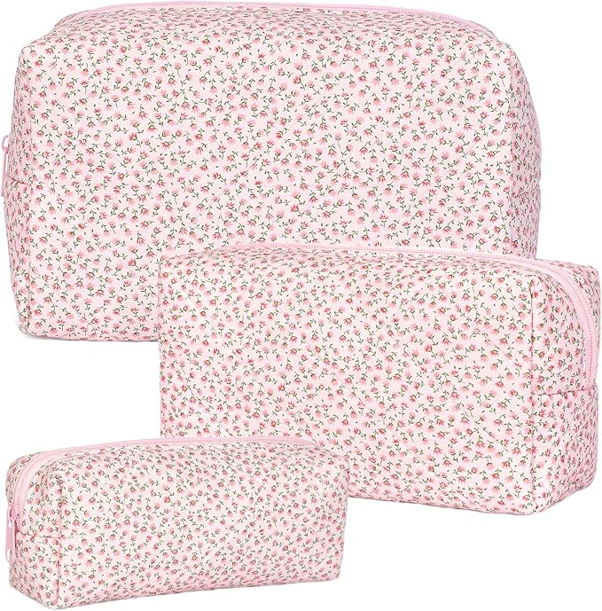Quilted Makeup Bag Set,Large Floral Cosmetic Pouch For Women,Cute Cotton Brushes Storage Travel Toiletry Organizer Bags(Pink Floral)