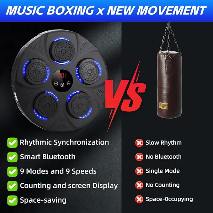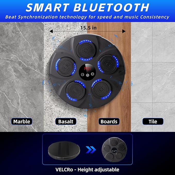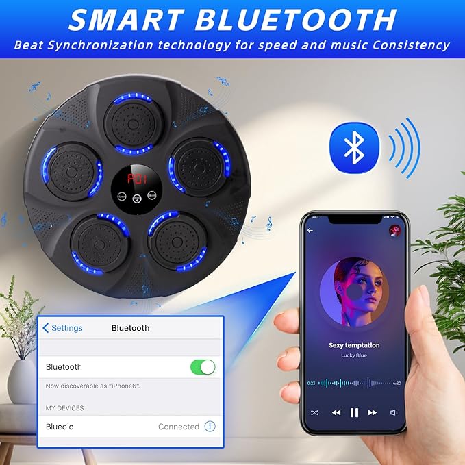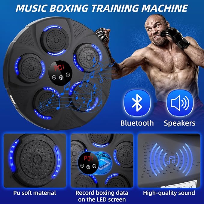 - The LED display screen and Bluetooth will show your click count and record every progress and growth you make. The smart music boxing machine supports Bluetooth music, allowing you to choose your favorite songs during boxing training. Surround speakers and cool lighting immerse you in training.